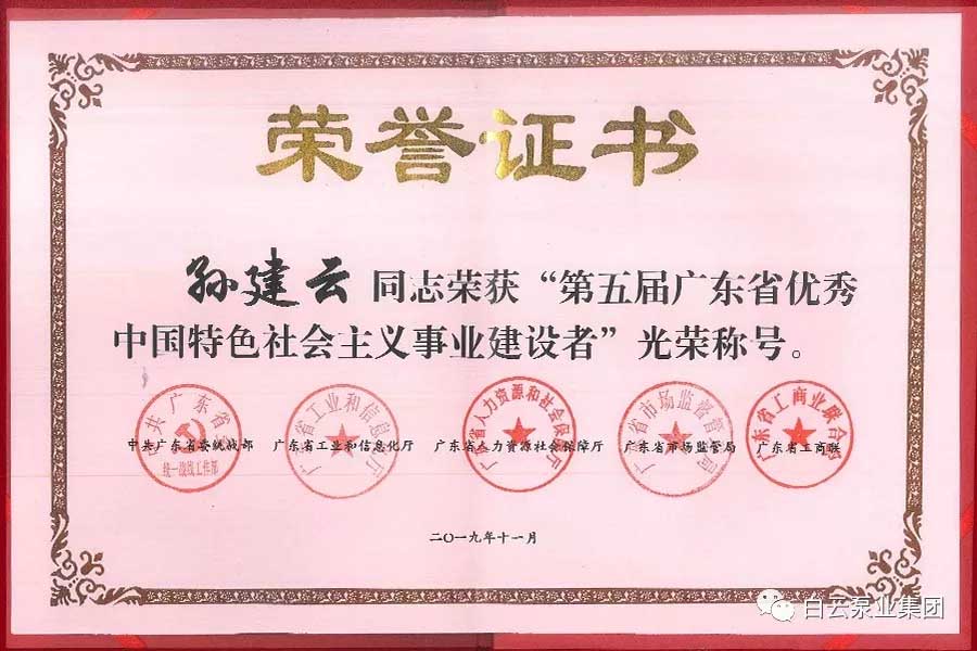 热烈祝贺孙建云董事长荣获“第五届广东省非公有制优秀中国特色社会主义事业建设者”称号