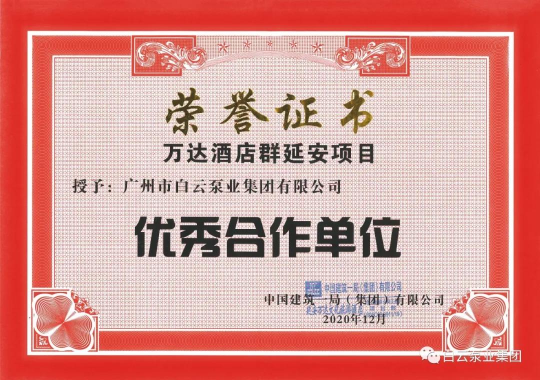 2020年12月,中建一局集团万达酒店群延安项目合作商表彰会在项目部会议室召开,亿万28泵业集团荣获“优秀合作单位”称号。