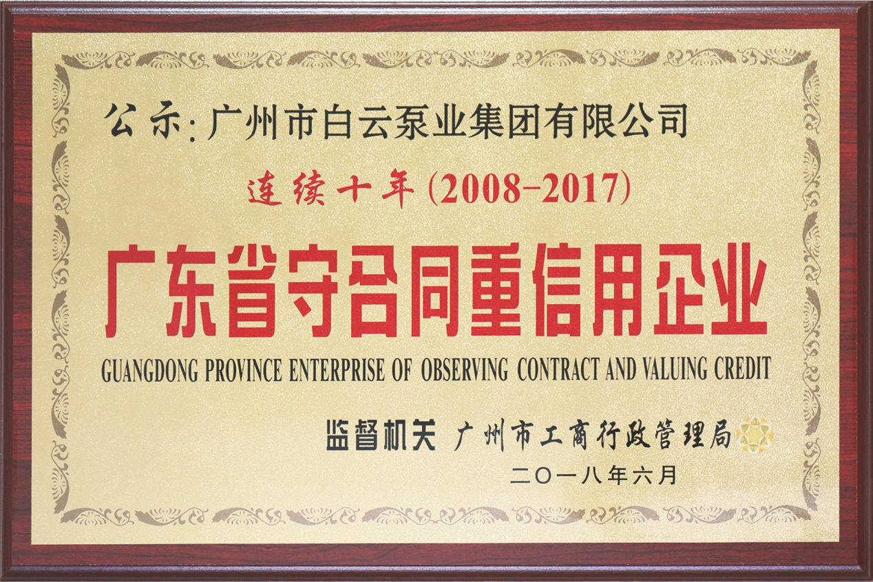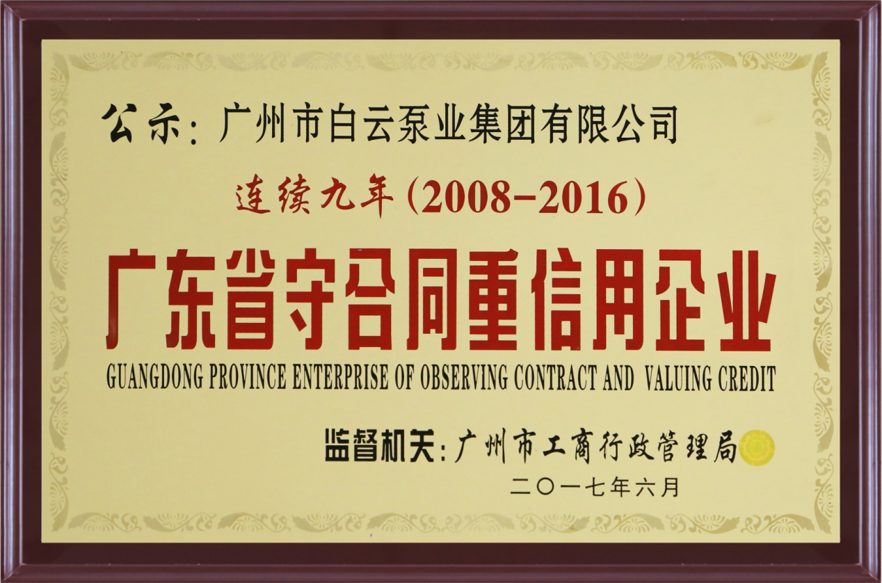 2017年6月,经广东省工商行政管理局审核批准,亿万28泵业集团公司再次获得“广东省守合同重信用企业”荣誉证书。这是公司连续九年(2008年-2016年)获得该荣誉。