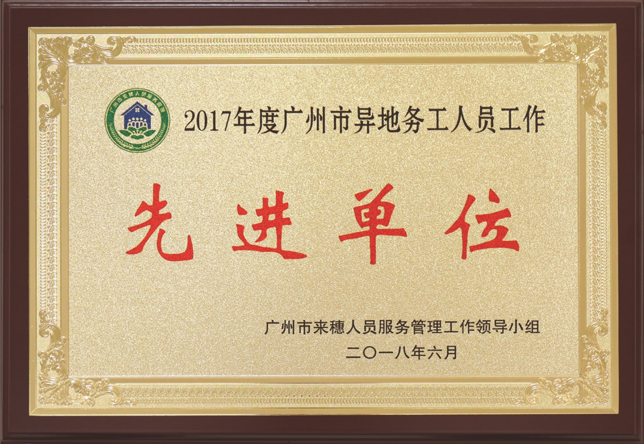 2018年6月,在广州市来穗人员服务管理局牵头组织的2017年度广州市优秀异地务工人员和集体推荐工作中,集团获评“2017年度广州市异地务工人员工作先进单位”荣誉称号。
